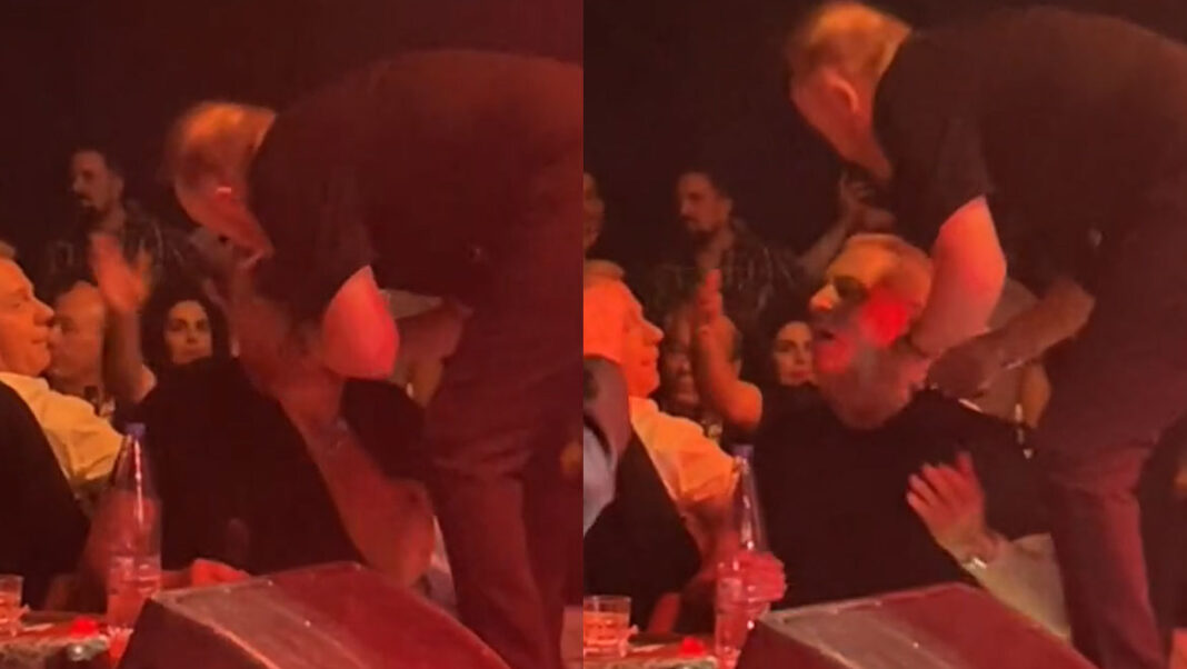 Θαμώνες του νυχτερινού κέντρου κατέγραψαν τη στιγμή, ενώ ο Αλέξανδρος Τσουβέλας, που ήταν μέλος της ίδιας παρέας, ξέσπασε σε γέλια.