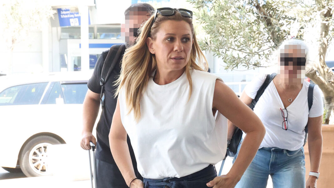 Ευδιάθετη και casual ντυμένη, η Κατερίνα Καραβάτου υποδέχτηκε τους φωτορεπόρτερ κάνοντας δηλώσεις στα τηλεοπτικά συνεργεία που την περίμεναν στο αεροδρόμιο «Ελευθέριος Βενιζέλος».