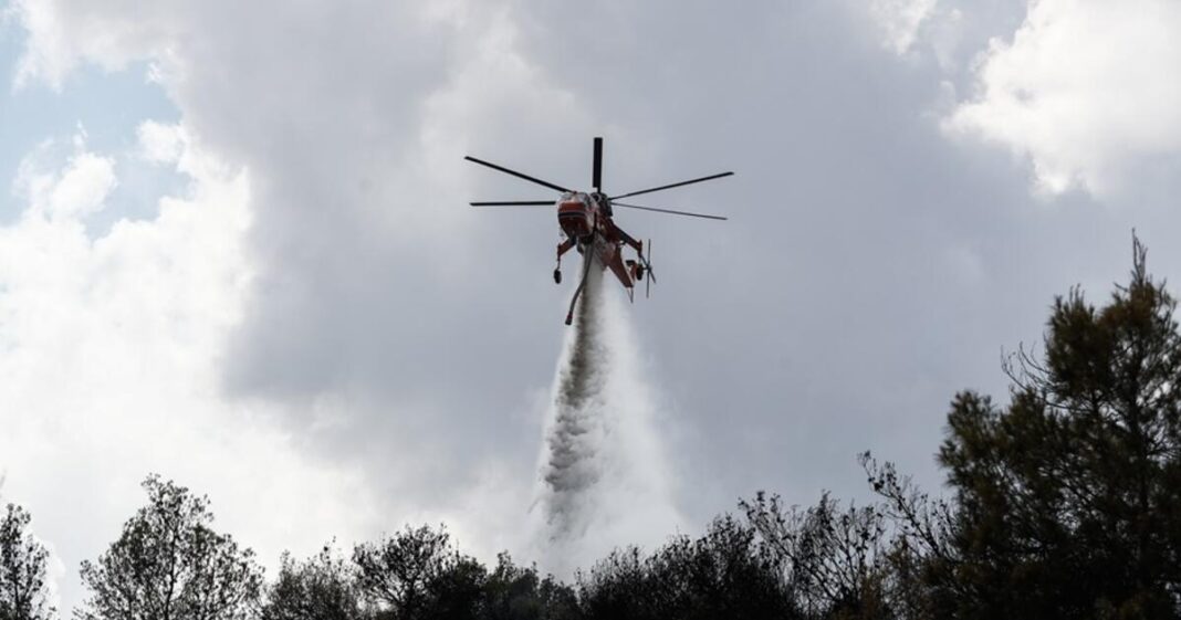 Δύο προσπαθούν να σβήσουν τη φωτιά πυροσβέστες με ένα όχημα, ενώ δύο ελικόπτερα και δύο αεροπλάνα ρίχνουν νερό από τον ουρανό, ενώ μια ομάδα προσγειώνεται μπροστά Δασοφύλακας με ένα σούπερ πούμα.