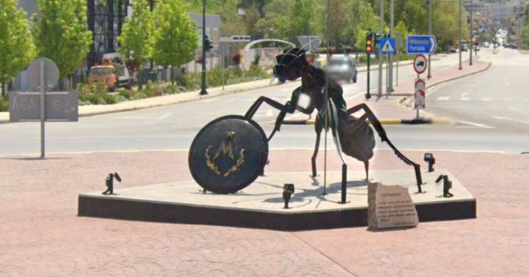 Λίγα χρόνια αργότερα όμως, η περιοχή της Θεσσαλίας, θέλοντας να τιμήσει τον μυθικό στρατό του Αχιλλέα, τους Μυρμιδόνες, έστησε ένα ακόμη μνημείο στην είσοδο της πόλης. Το καλοκαίρι του 2020, εν μέσω καραντίνας για τον κορωνοϊό, το μνημείο ανεγέρθηκε στον κυκλικό κόμβο, γεγονός που πυροδότησε αντιδράσεις από την πρώτη στιγμή. Ο λόγος; Για τι αντιπροσωπεύει ένα γιγάντιο μυρμήγκι που κρατά μια ασπίδα.