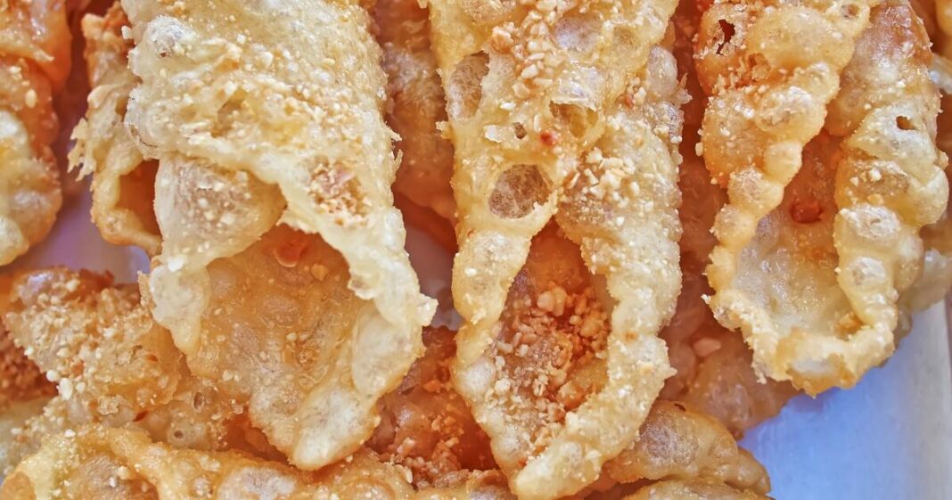 - Ανοίγουμε τη ζύμη σε ένα πολύ λεπτό φύλλο χρησιμοποιώντας έναν πλάστη. Τα κόβουμε σε κομμάτια και τα μεταφέρουμε στο καυτό λάδι. Τηγανίζουμε για 1 λεπτό να πάρουν χρώμα.