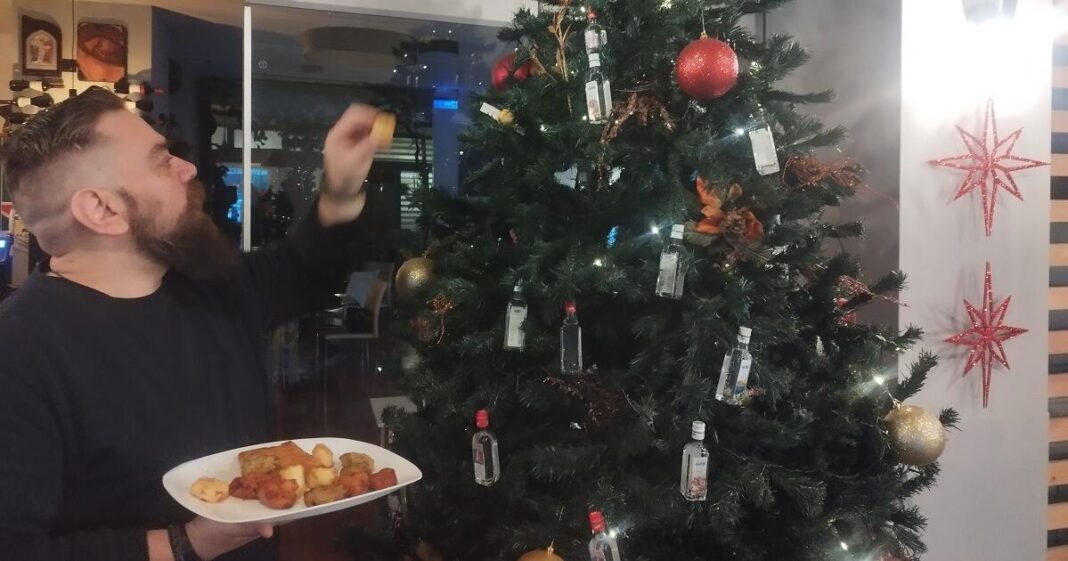 Ο ιδιοκτήτης του ψαροταβέρνα με το λαχταριστό δέντρο εξηγεί στο αθηναϊκό/μακεδονικό πρακτορείο τύπου ότι αποφάσισε να στολίσει το χριστουγεννιάτικο δέντρο που στολίζει το μαγαζί του με χιούμορ και υλικά για καλοφαγάδες, που αντιστοιχούν σε δύο μεγάλα τραπέζια.
